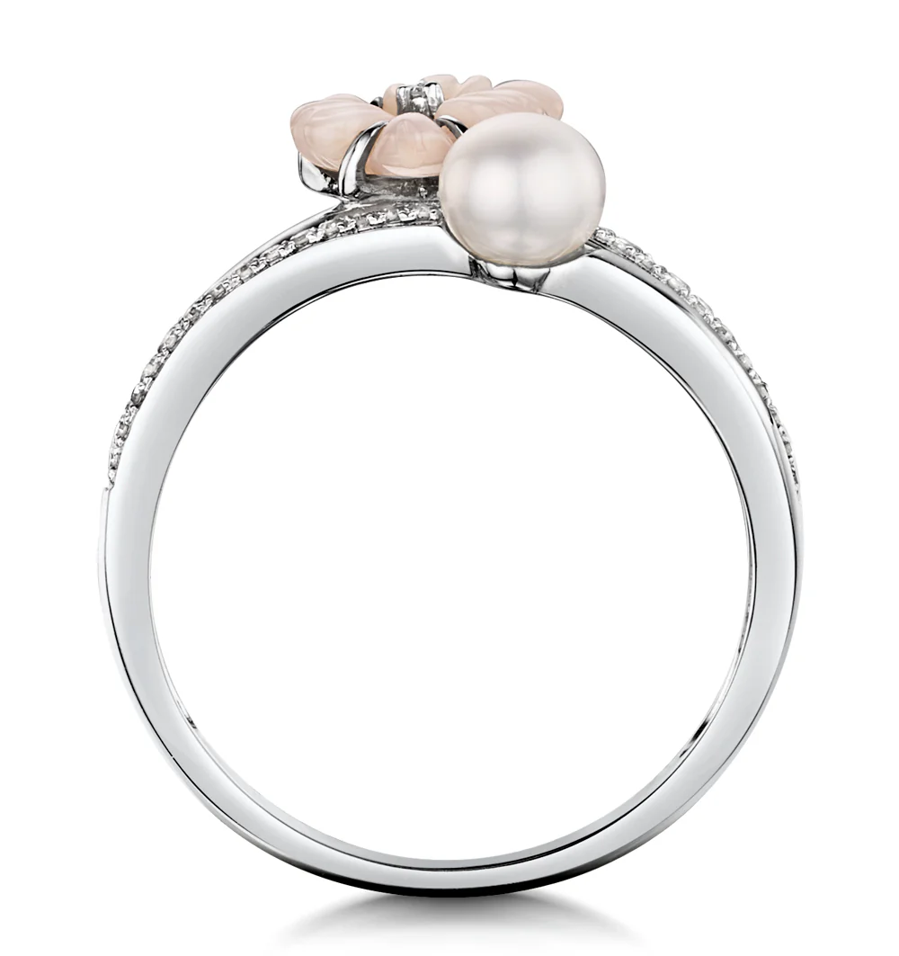 Exquisite and dainty this ring exudes classic, ultra-feminine luxury. Its intricate white gold double band studded with diamonds is perfect for disaplying a single oriental freshwater pearl and a delicate blush floral shell detail. A beautiful piece of craftsmanship, this ring is an ideal gift for someone special.