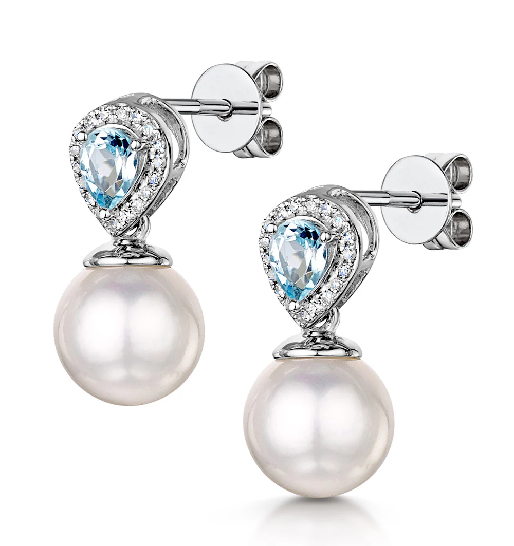 7.5mm Pearl Blue Topaz and Diamond Stellato Earrings in 9K White Gold