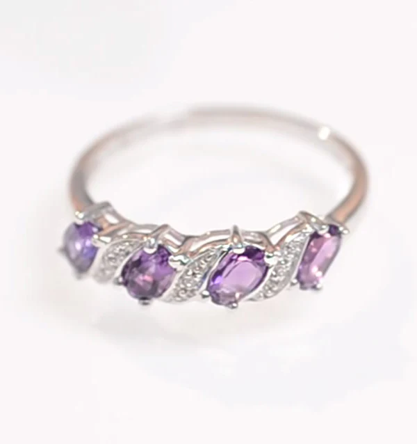 This alluring amethyst ring is an eye-catching piece which makes a thoughtful gift for anyone who celebrates their birthday in February or who simply loves beautiful jewellery. The majestic oval amethyst stones have been beautifully intertwined with 0.01CT of Premium Quality Diamonds and made complete with a 9K white gold band.