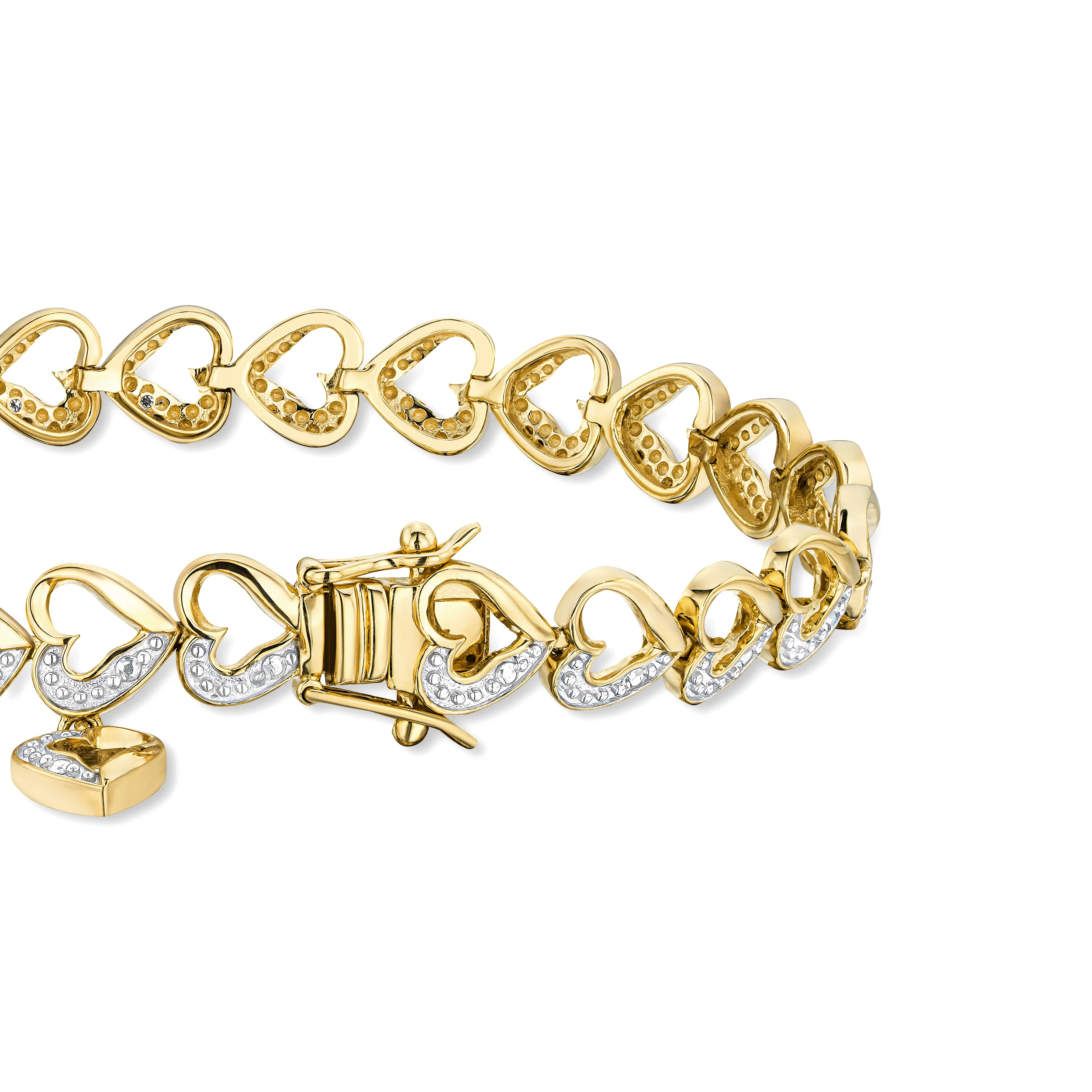 Discover our elegant Diamond Heart Bracelet, featuring 0.02ct diamonds set in the finest gold vermeil. The pavé diamond hearts wrap around the wrist, giving the illusion of never-ending stones, and sparkling with every movement. The bright white stones stand out against the warm tones of the gold vermeil, emphasising their beauty and radiance. A secure clasp holds the piece together, and features a hanging pavé heart, for an extra, sparkling detail. The heart motif makes this a meaningful gift for a loved one, perfect to celebrate an occasion or mark a milestone. *Video features the Diamond Silver Heart Bracelet.