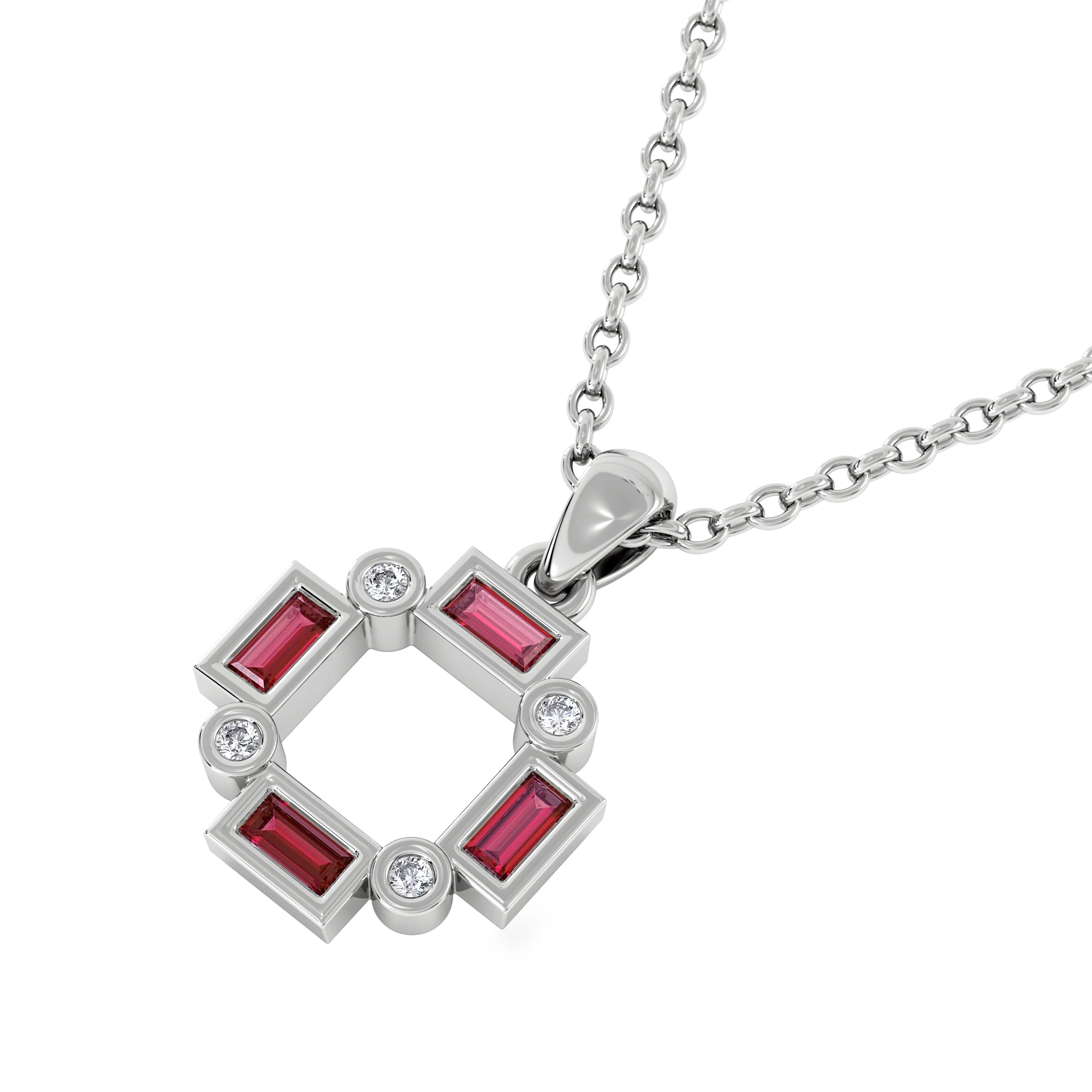 Discover our Ruby Necklace, featuring 0.48ct of deep red lab-grown rubies and 0.06ct of shining lab-grown diamonds, set in the finest sterling silver on an 18inch trace chain. Inspired by Art Deco elegance, this necklace features baguette cut rubies and round diamonds set in a circular pattern, for sparkle with every movement. The rubies make this piece especially meaningful for July birthdays, as the stone’s birth month significance adds sentimental value. Crafted from recycled materials and ethical, lab-grown stones, this necklace offers timeless beauty with a sustainable edge. Pair with our matching huggie earrings for a sophisticated set.