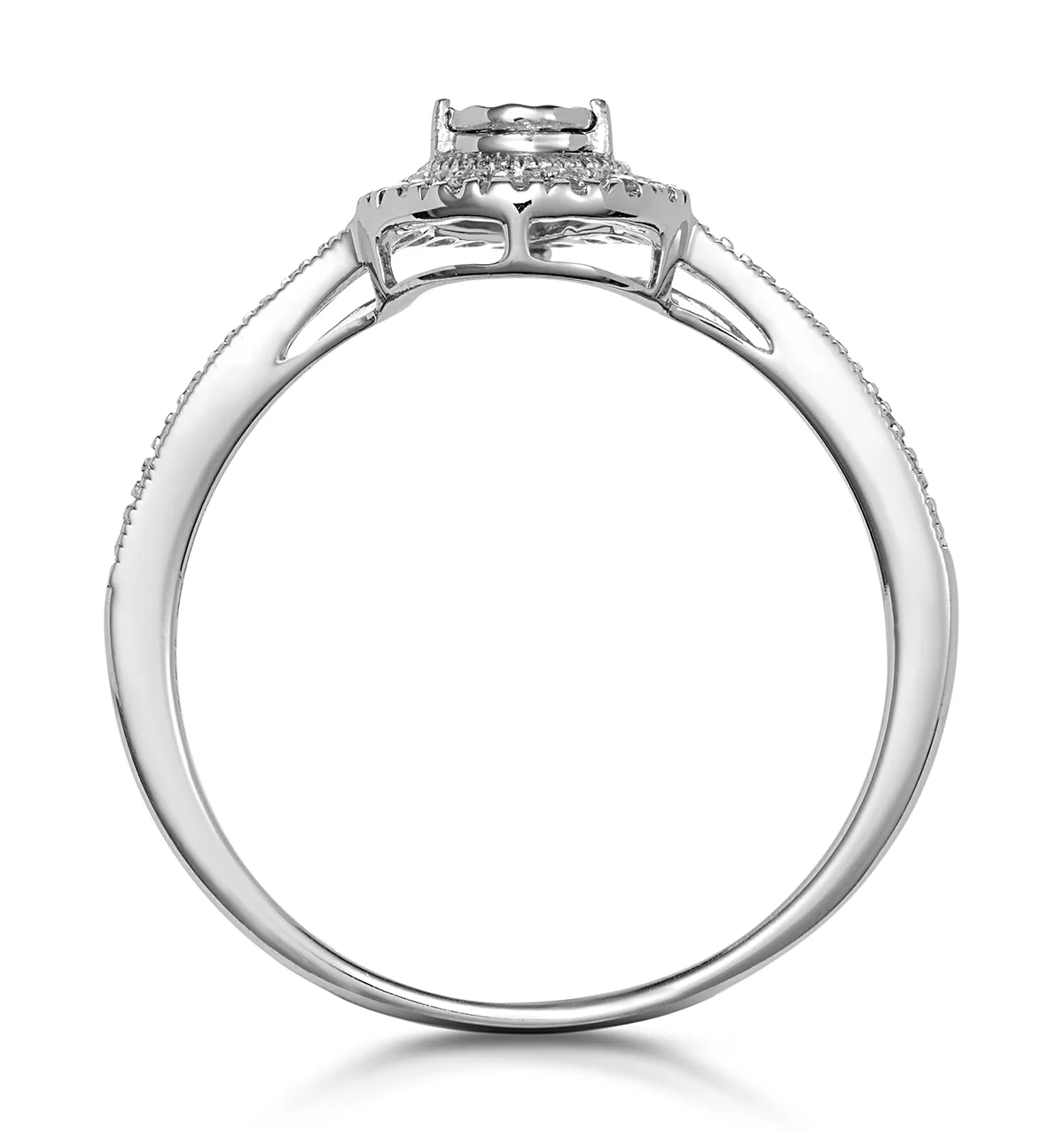 Discover our Masami Pear Shaped Pave Diamond Engagement Ring. This beautiful ring features 0.15ct of white diamonds, crafted in a traditional pear shape with side stones, set in the finest 9K white gold. The pave diamond setting adds a touch of glamour, creating sparkle with every movement. The clever illusion of the central stone's setting enhances the carat weight, making it exceptional value. Ask the important question with the Masami ring.