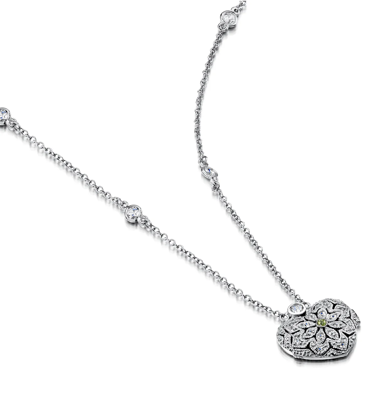 This gorgeous vintage style locket features a beautiful peridot gem, the birthstone for August. The locket opens up so that you can store a lock of hair or a miniature photograph inside. Handcrafted with sterling silver and accented with white topaz gems on the chain, it's the perfect gift for your loved one's special occasion.