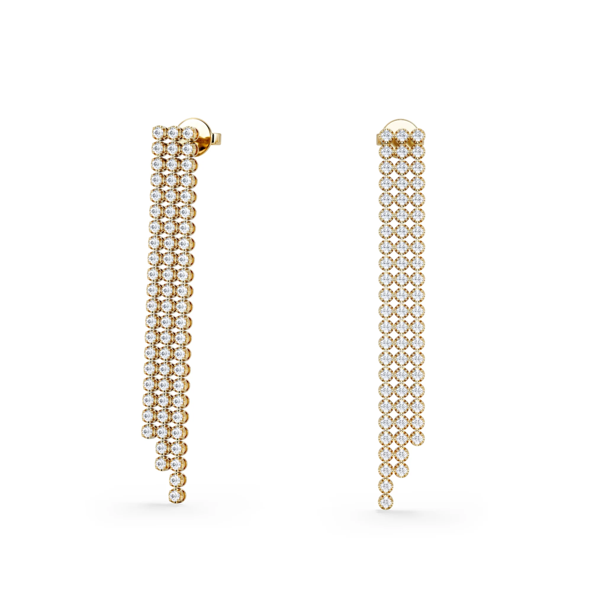 Make an entrance in these triple-row drop earrings, featuring 1.75ct of prong-set G/VS lab-grown diamonds. Crafted in recycled 18K yellow gold and lab-grown stones, these are sustainable statement earrings; perfect for going out, dressing up, and turning heads.