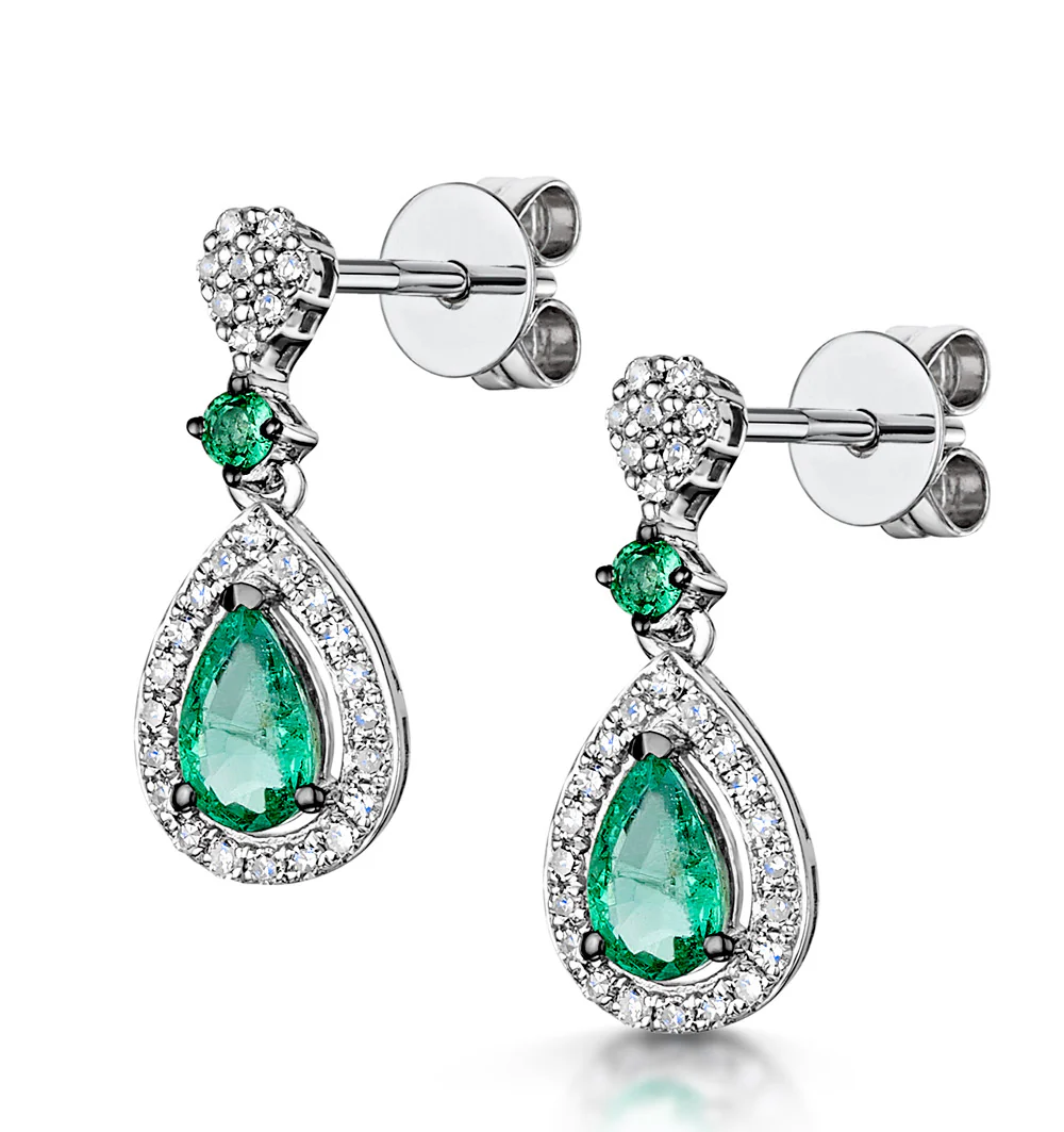 This captivating pair of dainty, glittering emerald and diamond drop halo earrings evokes exotic Old World elegance and charm. The 0.44CT of emeralds are encircled with 0.19CT of premium diamonds. A true design piece, they're set in lustrous white gold. A perfect gift for any important occasion.